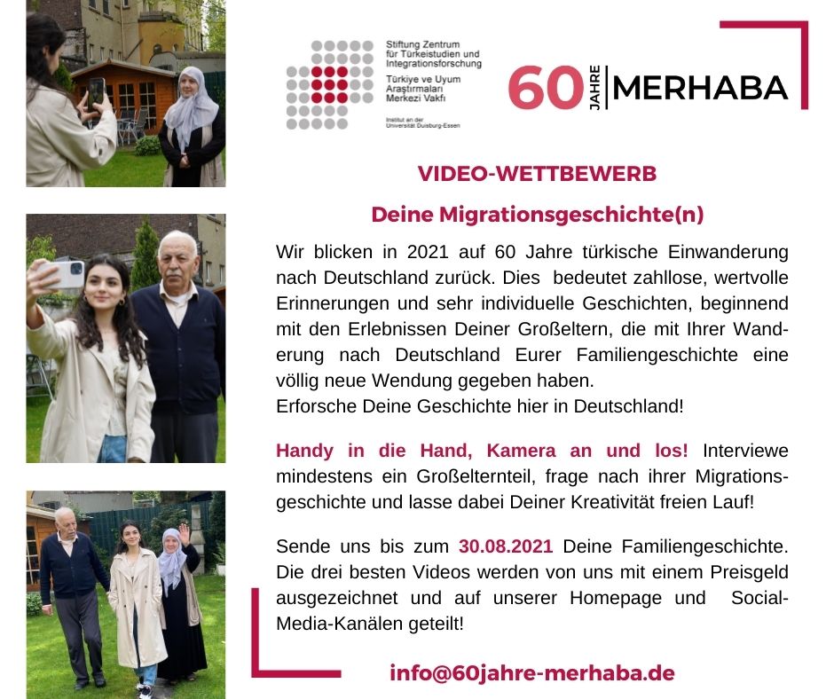 Wir geben mit dieser Aktion jungen Menschen aus der dritten und vierten Generation der Türkeistämmigen die Möglichkeit, sich intensiv mit ihrer eigenen Familiengeschichte, die über die Gastarbeiter*innen-Anwerbung begann, auseinanderzusetzen. Die jungen Menschen erhalten die Chance, mit einer Kamera oder einem Handy ausgestattet, ihre familiären Migrationsgeschichten als Gespräch mit der Groß- oder Urgroßelterngeneration im Videoformat festzuhalten. Damit können nicht nur die eigenen Familiengeschichten aufgezeichnet, sondern auch ein Beitrag zur unserer gemeinsamen Migrationsgeschichte und Erinnerungskultur geleistet werden. Die ersten drei Videos werden mit einem Geldbetrag prämiert. Vielleicht haben Sie in der eigenen Familie eine solche Mehrgenerationsentwicklung mit Nachwuchs ab 16 Jahren, die das Format in Angriff nehmen könnte. Womöglich kennen Sie solche Familien bzw. können für das Format werben.