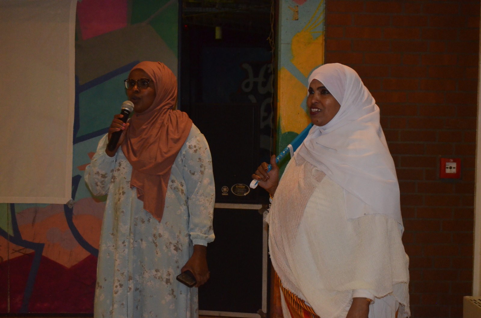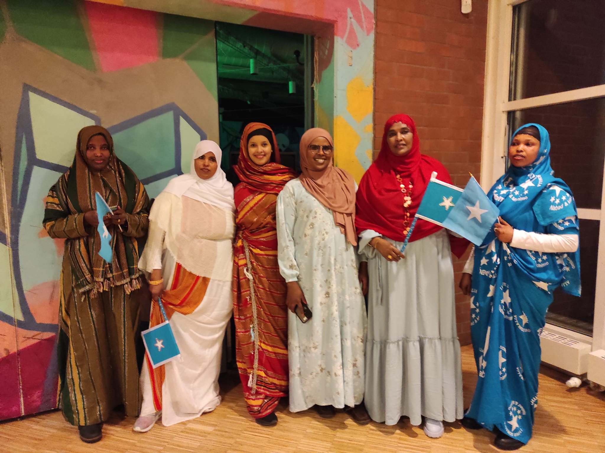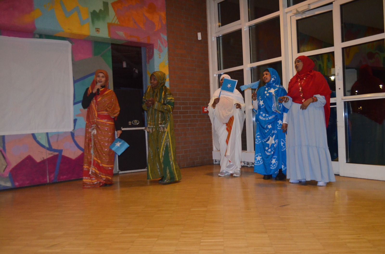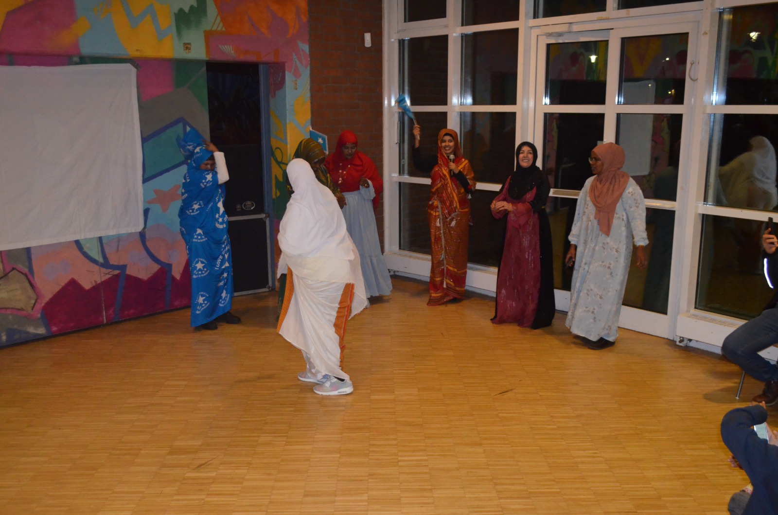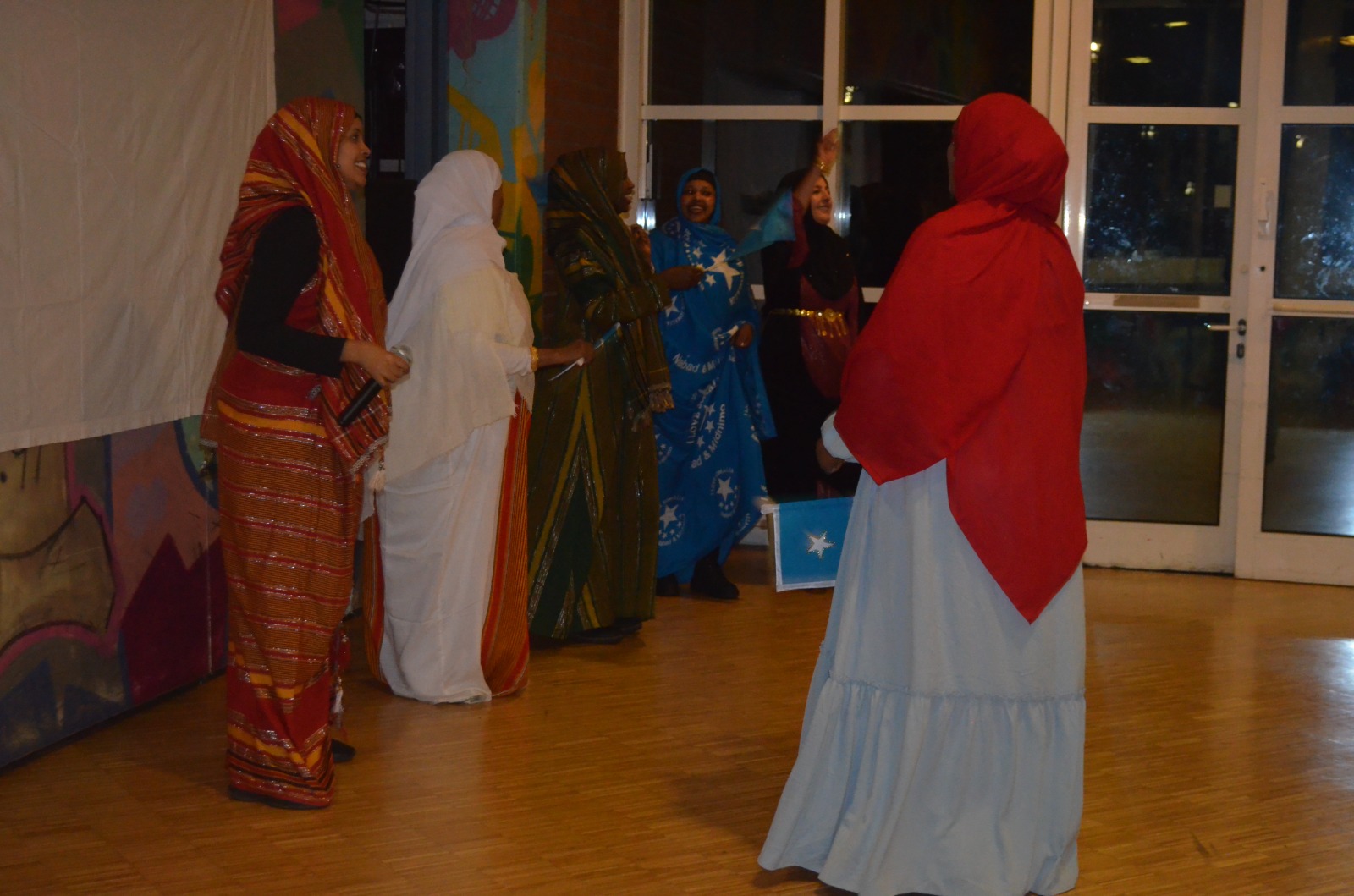 Sarah Egal und schön gewandete Tänzerinnen aus Somalia tanzen voller Energie und Lebensfreude zur Musik aus Somalia. Sarah hält eine kleine Ansprache über die Freude, auf einer gemeinsamen Feier so viele Kulturen kennenzulernen!