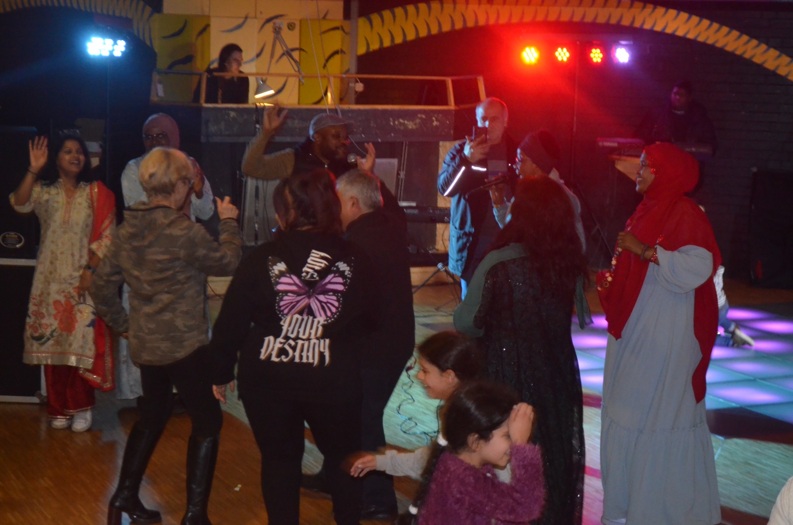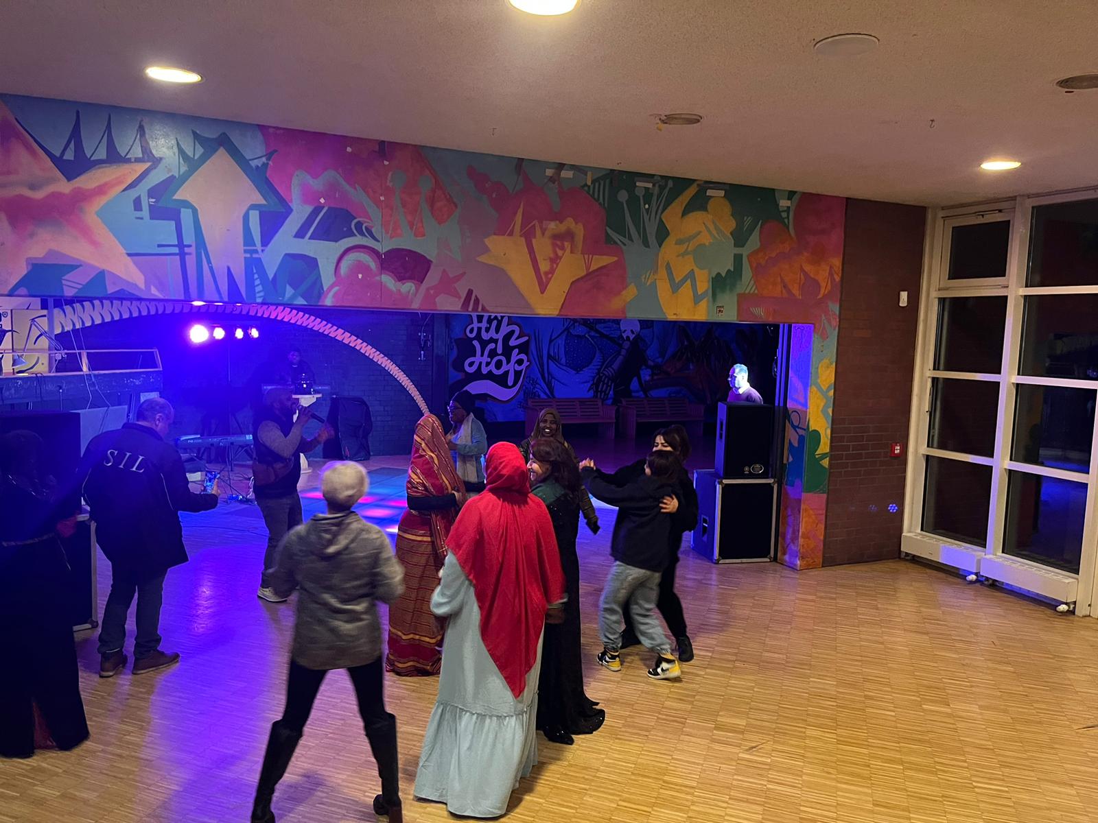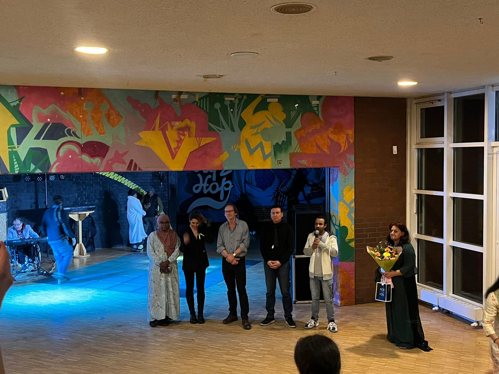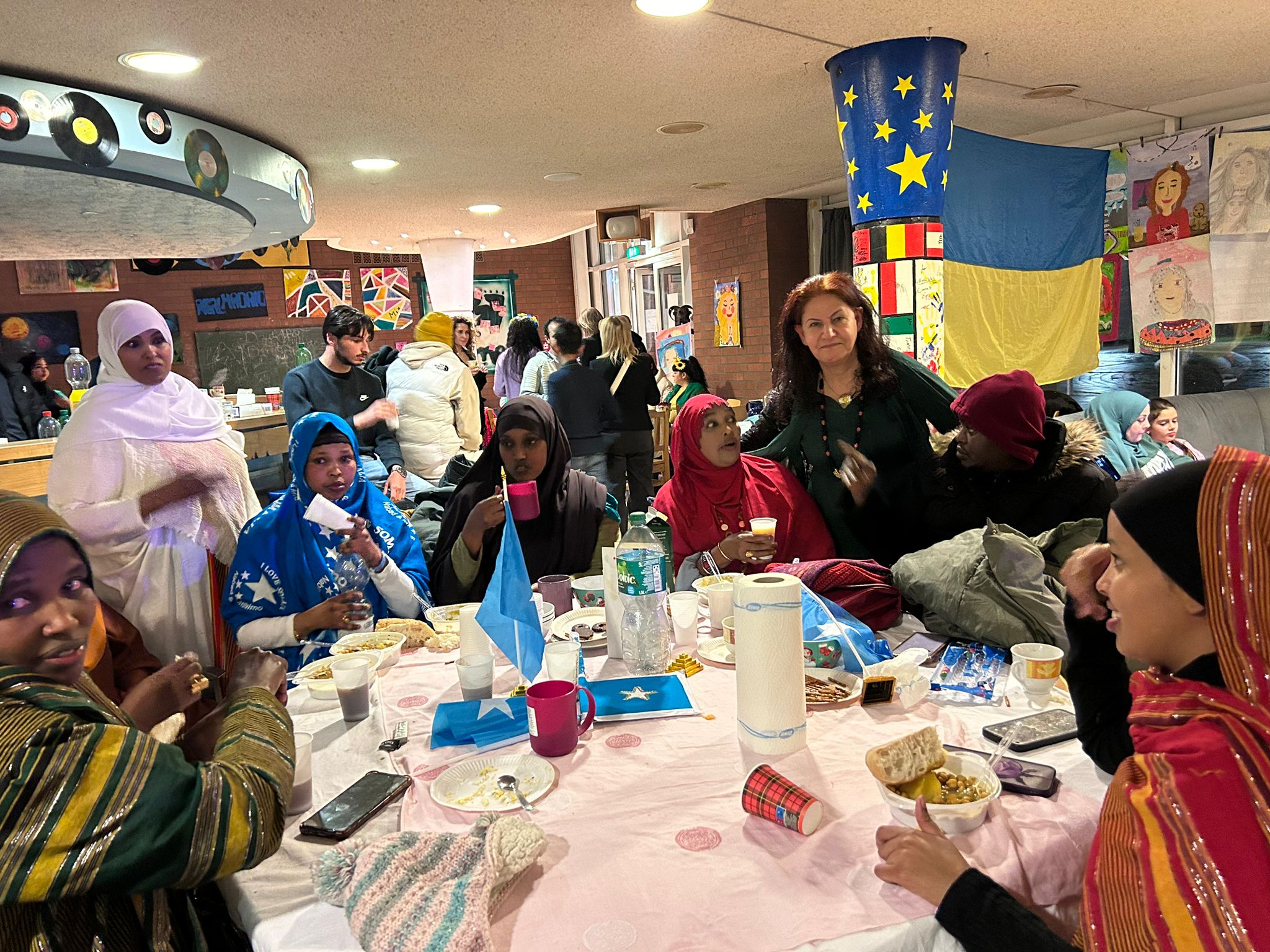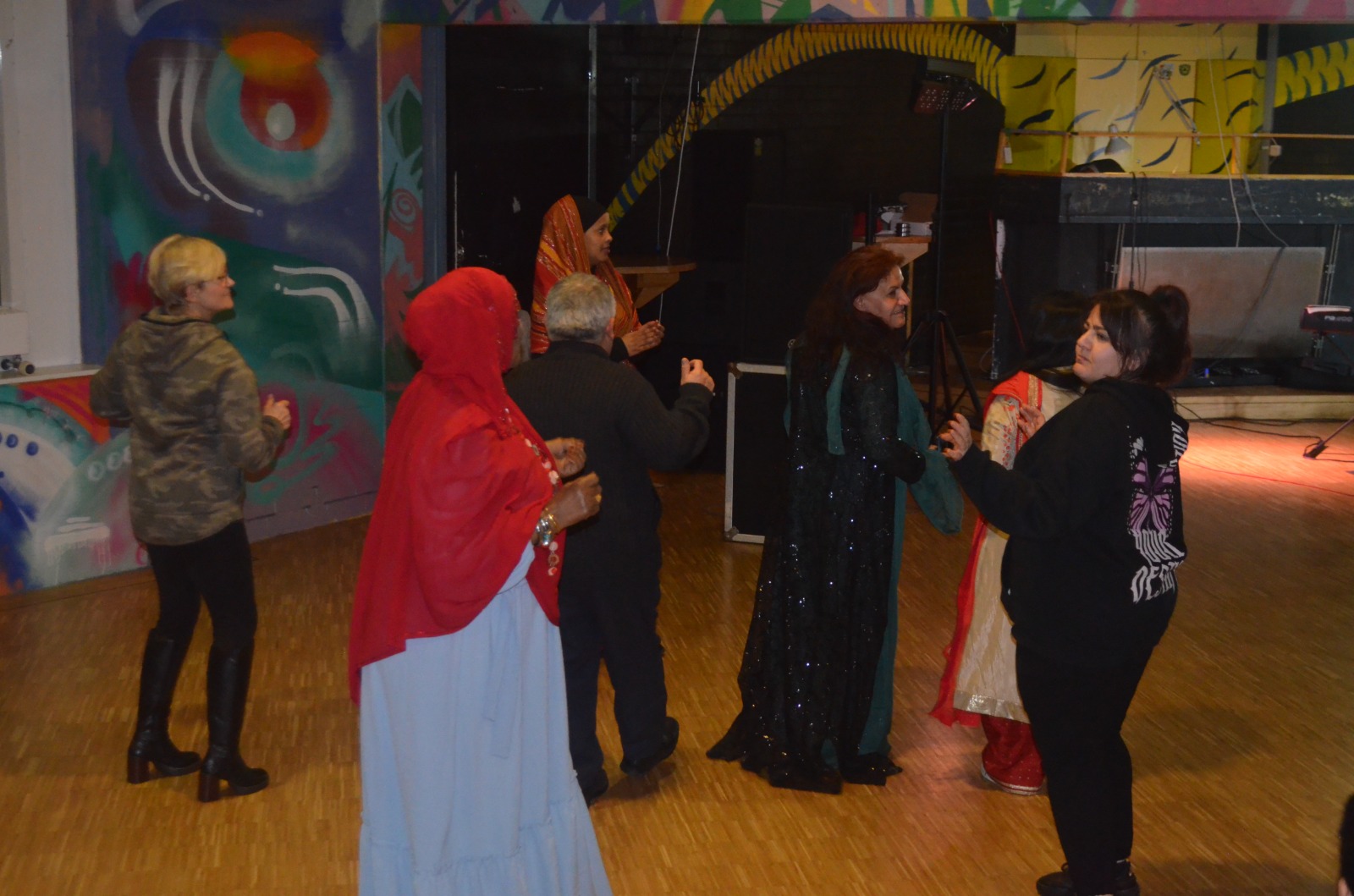 Sarah Egal und schön gewandete Tänzerinnen aus Somalia tanzen voller Energie und Lebensfreude zur Musik aus Somalia. Sarah hält eine kleine Ansprache über die Freude, auf einer gemeinsamen Feier so viele Kulturen kennenzulernen!