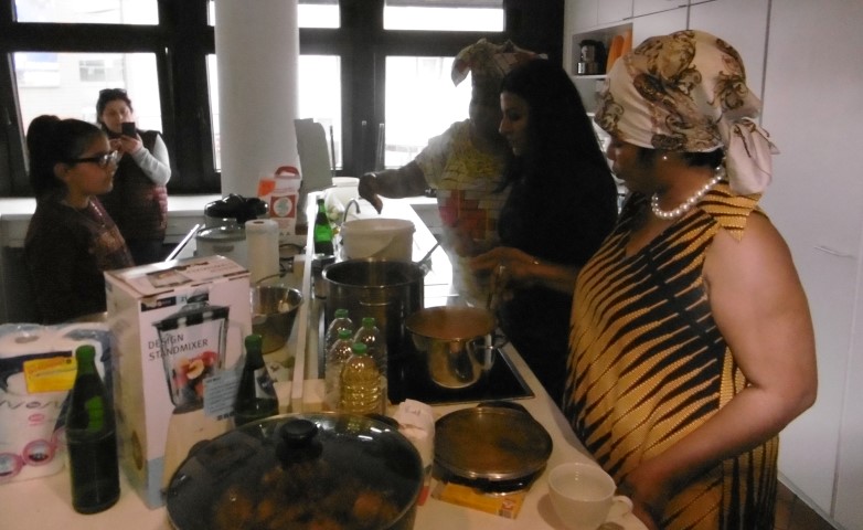 Die “Chefköchinnen“ Josée Mulumba und Olga Younga hatten für dieses Treffen die Zutaten für ein rustikales kongolesisches Menu (gebratene Hähnchenflügel in Erdnussbuttersauce, Reis und (Dessert 'beignets‘)/ Rezept folgt)) schon zu Hause vorbereitet: Blieb nur noch, alle Speisen fertig zu braten oder zu garen und zu servieren.