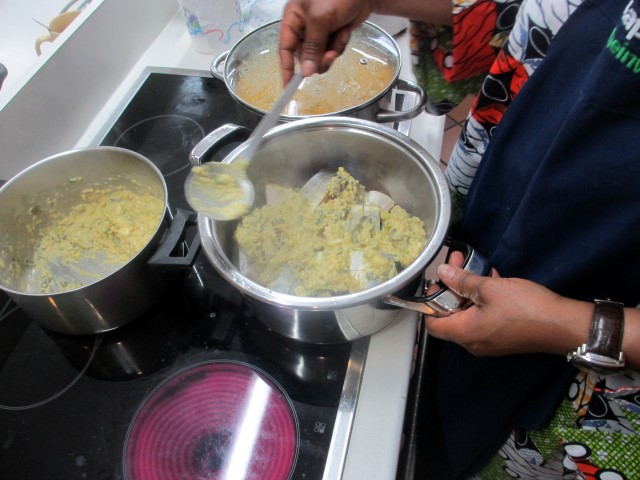 Zum Hauptgang wurden zwei Speisen gereicht: Zum einen eine leckere Variation von Mbisi, Pangasius Steak, sowie ein Hühnchengericht namens Mbikano Soso. Als Beilage gab es gedämpften Reis, Semoule (Grieß), weiße Bohnen in Tomatensauce und Manioko nugba (Maniok) und Arachides (Erdnüsse). Werfen Sie doch einen Blick in das beigefügte Rezept und probieren Sie die typisch kongolesische Küche!