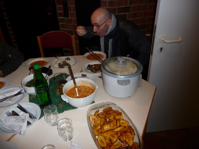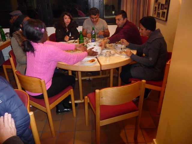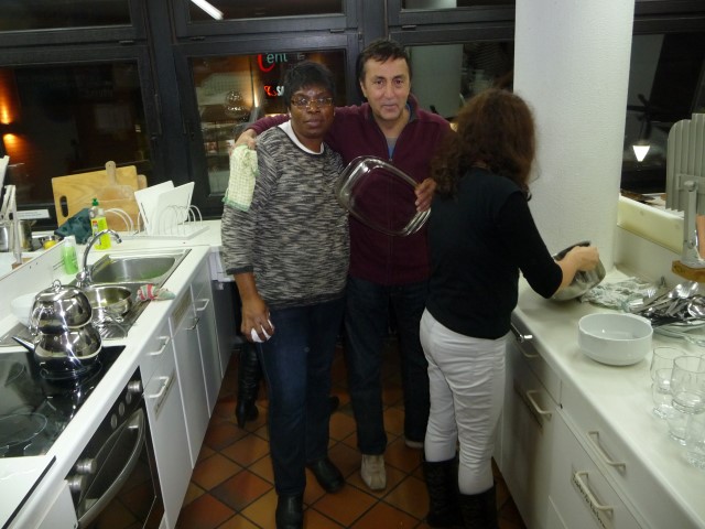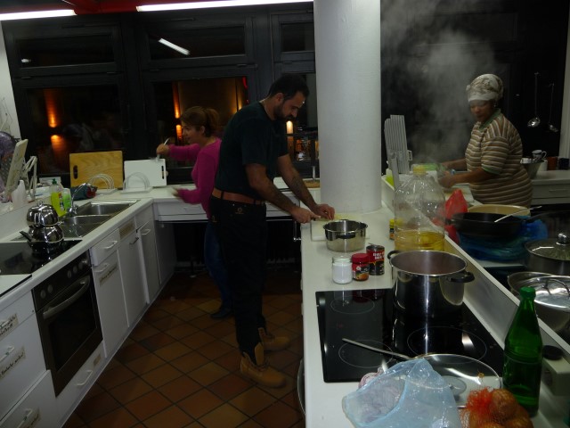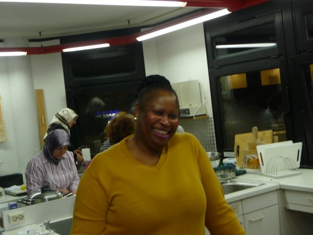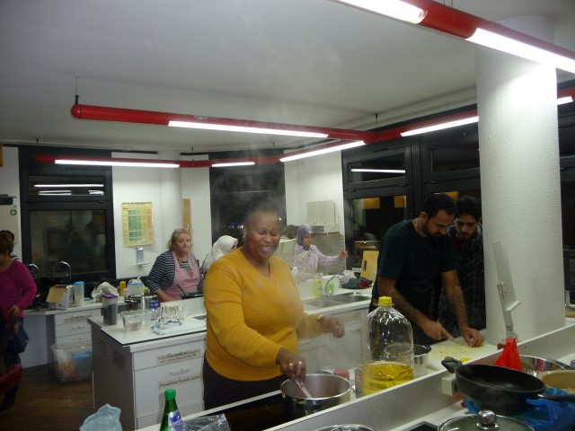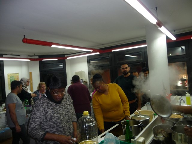 Wieder einmal hatten “Chefköchin“ Josée Mulumba, assistiert von Nani Mubiala und Olga Younga, alles perfekt organisiert und einen Teil der Mahlzeiten schon zu Hause vorbereitet; die Gäste und MitköchInnen kamen wieder aus aller Herren Länder: Afghanistan, Algerien, Irak, Kurdistan/Irak, Kongo, Syrien, Ttscheschenien und der Türkei. Herzlich willkommen waren neuzugewanderte Flüchtlinge aus den städtischen Asylunterkünften.