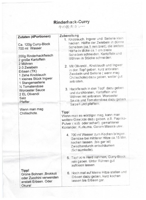 Karē (jap. カレー) ist ein Lehnwort aus dem englischen Curry und bezeichnet hauptsächlich ein heißes Gericht, bestehend aus einer dicken Currysauce, welche üblicherweise zu Reis serviert wird. Die meiste Arbeit ist wohl, das ganze Gemüse klein zu schneiden, aber es gab ja ausreichend Helferinnen und Helfer in der Küche; schon bald durchzogen superleckere Düfte den Raum und ließen das Wasser im Mund zusammenlaufen.
