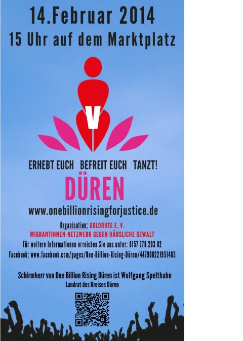 Am 14. Februar 2014 werden wir unsere Bemühungen noch verstärken: Wir rufen Frauen und Männer auf der ganzen Welt dazu auf, sich zu ERHEBEN, sich zu BEFREIEN, zu TANZEN und GERECHTIGKEIT einzufordern!
