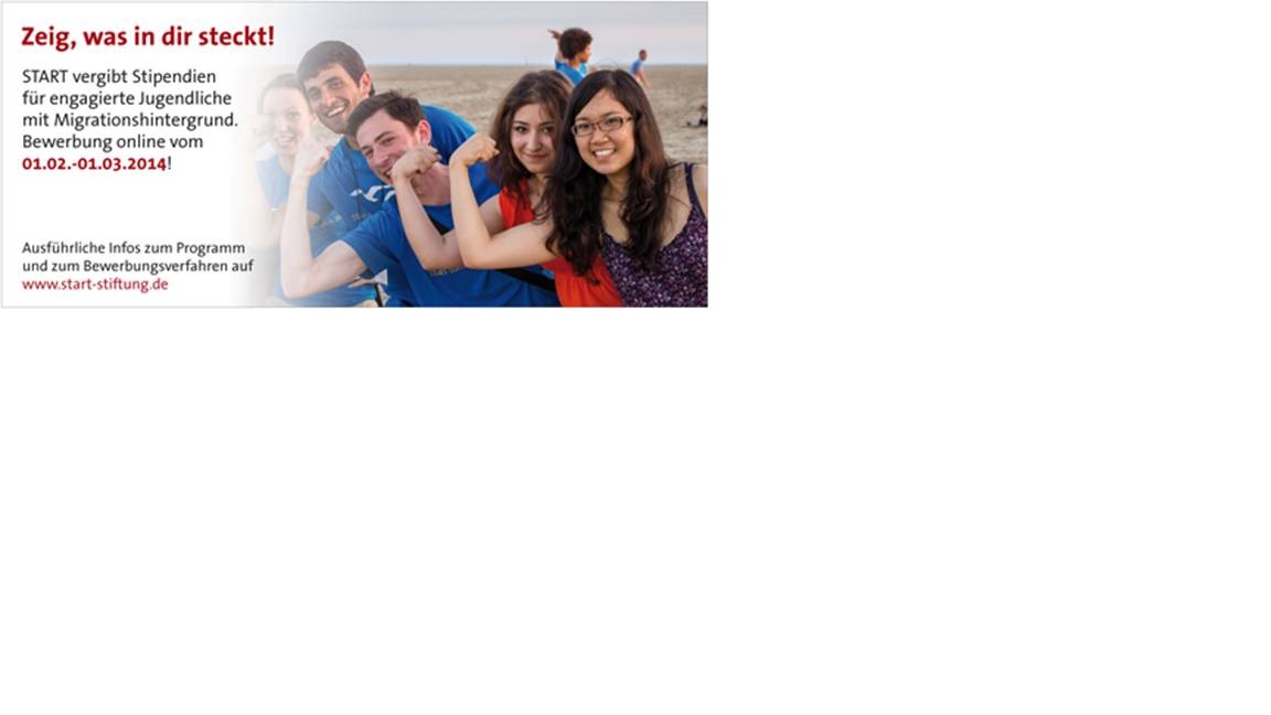 Ab 01. Februar können sich Schülerinnen und Schüler aus Migrantenfamilien wieder um ein START-Stipendium bewerben. Nähere Informationen zum Stipendienprogramm, zum Verfahren und zu den Bewerbungsbedingungen finden sich in den Anlagen sowie auf der Seite